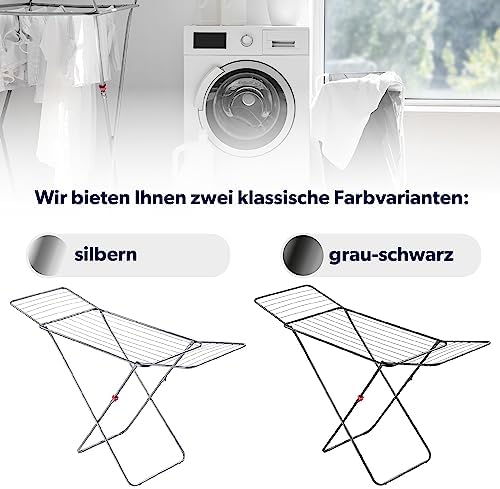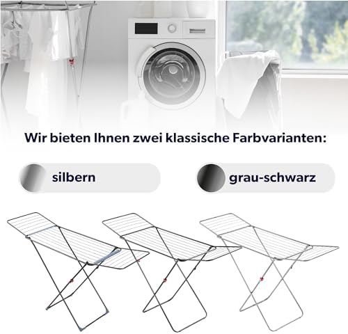Der Wäscheflügeltrockner Verde besticht durch sein minimalistisches und ästhetisches Design, das in zwei klassischen Farben verfügbar ist: silbern und grau-schwarz. Diese Farbvarianten fügt sich harmonisch in jede Wohnumgebung ein und sorgen für einen modernen Touch in Ihrem Zuhause.
