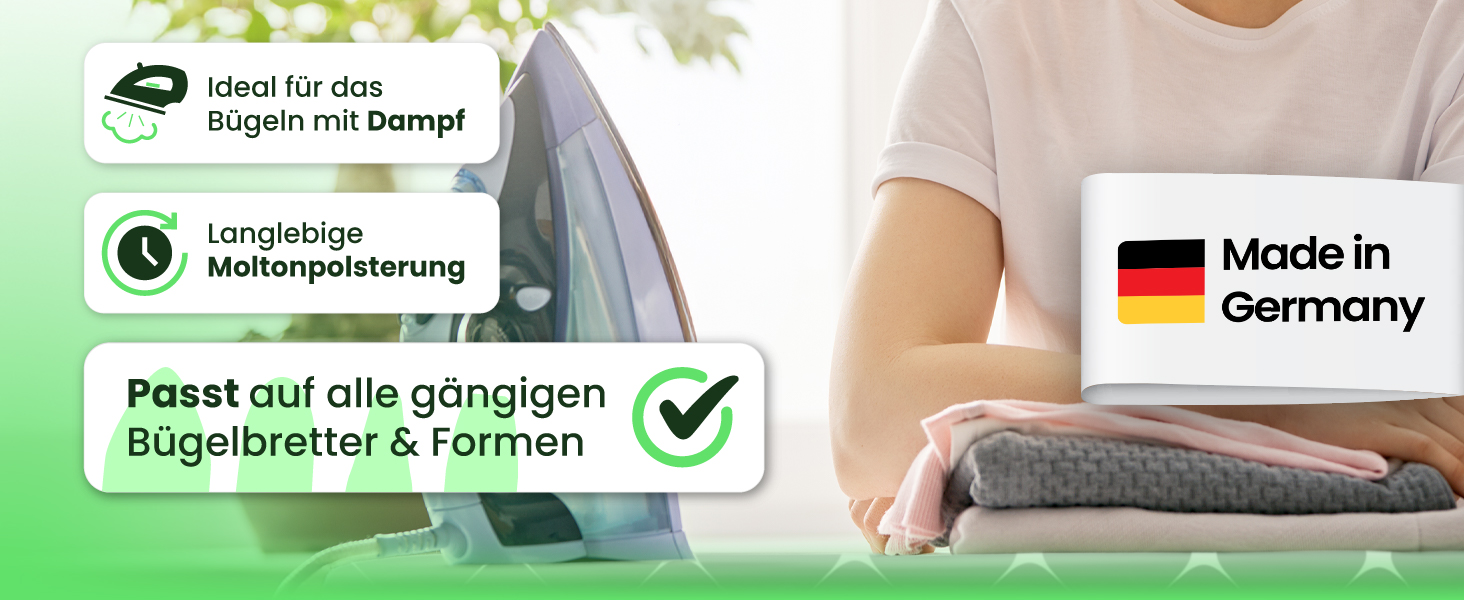 Wir entwickeln ausschließlich Produkte, die wir selbst gerne nutzen – das ist unser Motto. Bei Fragen stehen wir Ihnen jederzeit zur Verfügung, um Ihr Bügelerlebnis ideal zu gestalten. Vertrauen Sie auf Qualität und genießen Sie die Leichtigkeit, die unser Bügelbrettbezug Ihnen bietet!