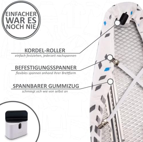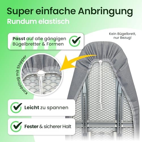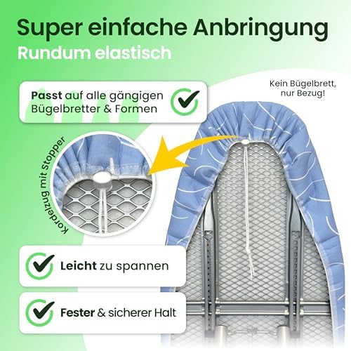 Dank des innovativen, flexiblen Zugbands sitzt der Bezug fest und faltenfrei auf allen Bügelbrettformen, ohne zu verrutschen. Atmungsaktive Stoffe verhindern eine Feuchtigkeitsansammlung und gewährleisten ein farbintensives Bügeln ohne Rückstände. So bleibt Ihr Bügelerlebnis immer angenehm und effektiv.