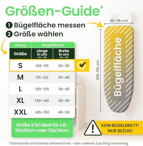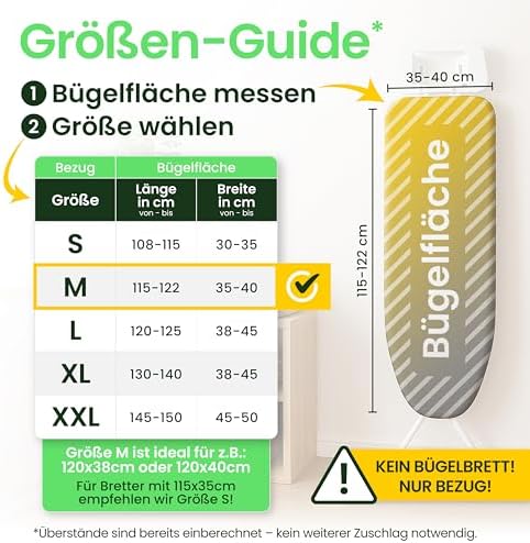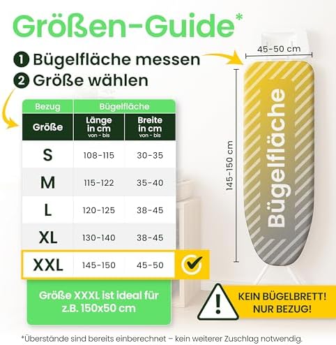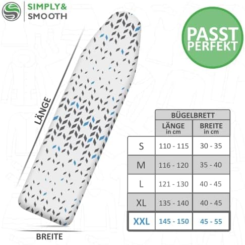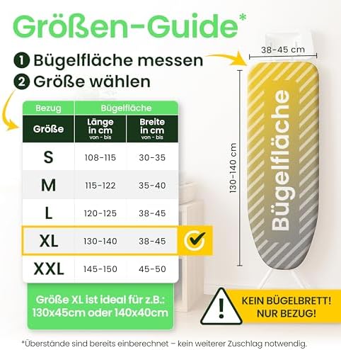 Der Bezug in Größe XL eignet sich für Bügelbretter mit einer Länge von 130-140 cm und einer Breite von 38-45 cm. Ideal für Bügelbretter wie z.B. 130 x 45 oder 140 x 40 cm. Die Abmessungen des Bezuges betragen 148 x 53 cm und garantieren eine passgenaue Abdeckung.