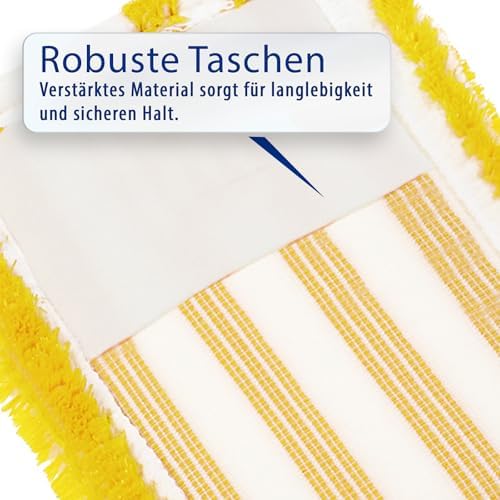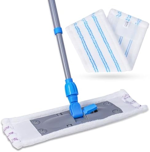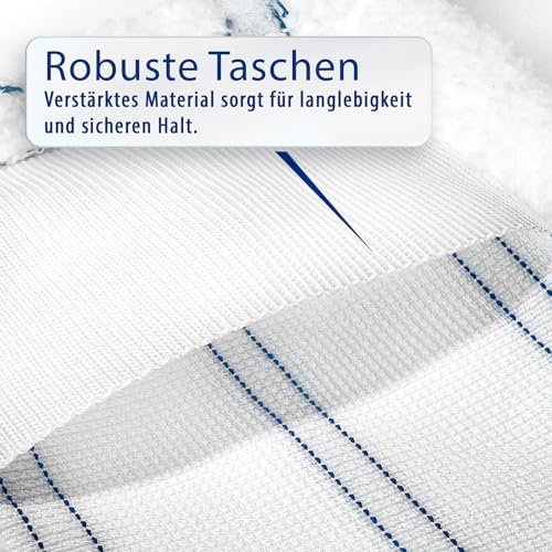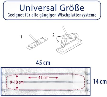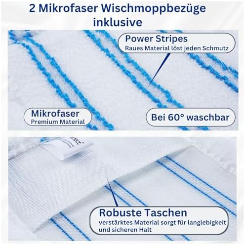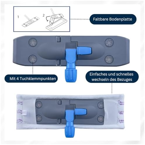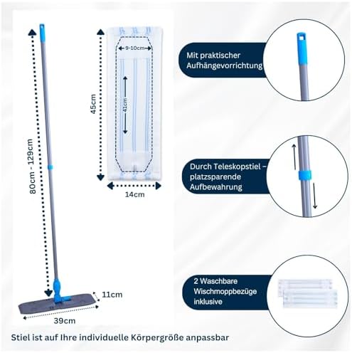 Die klappbare Bodenplatte des Wischers hat eine Größe von 39×11 cm und verfügt über vier Tuchklemmpunkte, die ein sicheres Halten der Bezüge garantieren. Die Ersatzbezüge messen 45×14 cm und sind leicht zu wechseln, sodass Sie immer für eine optimale Reinigung ausgestattet sind. Der Teleskopstiel lässt sich auf bis zu 129 cm ausziehen, was Ihnen Flexibilität und Komfort beim Wischen bietet und das Arbeiten in unterschiedlichen Höhen erleichtert.