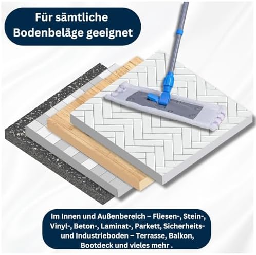 Unser Wischer Set ist nicht nur für Fliesen und Steinböden geeignet, sondern eignet sich auch hervorragend für Parkett, Laminat, Sicherheitsböden und viele weitere Oberflächen. Ob im Innen- oder Außenbereich – mit diesem Wischset erreichen Sie porentief saubere Böden überall in Ihrem Zuhause oder Büro.